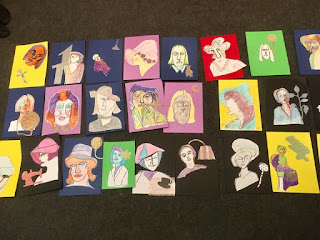 Heti alkuun annettiin paperia ja tussi, jotka otin kun kerran tarjottiin. Piti sutata muotokuva jonkun näyttelyssä roikkuvan muotokuvan pohjalta. Seuraavassa kohteessa tussilla vetäisty muotokuva väritettiin, leikattiin irti paperista ja liimattiin itse valitulle pohjalle. Lopuksi muotokuvaan lisättiin joku pieni yksityiskohta näyttelyssä esillä olevista tauluista. Sen saimme leikata ihanista kuvioiduista papereista. Paperin sai valita ihan itse.